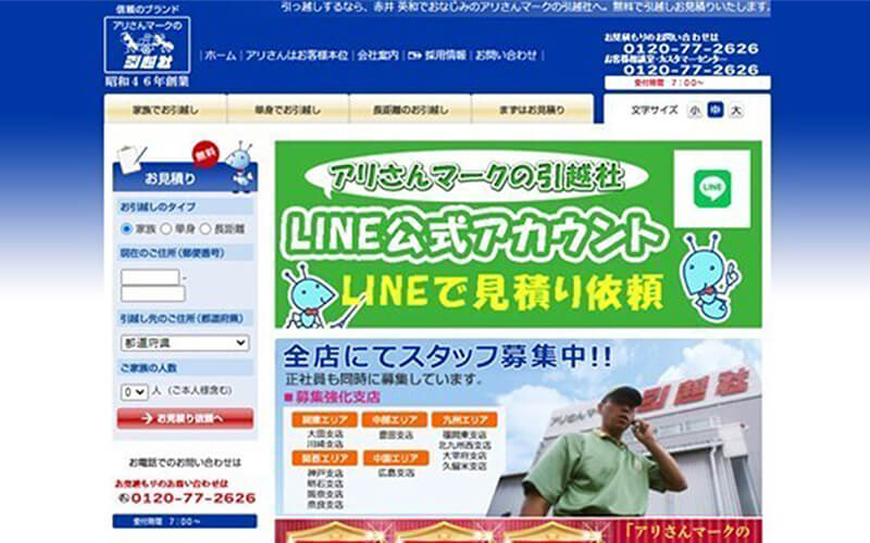 アリさんマークの引越社へ直接依頼で見積もりをもらう場合、まずはネットで住所や電話番号・引越し希望日などを入力(もしくはフリーダイヤルで連絡)します。アリさんマークの引越社はネット上での見積もりではなく、営業の方が訪問して見積もりを出すのが基本のようです。